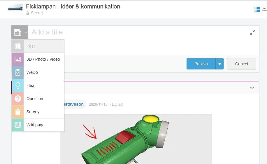 Skapa ett nytt inlägg i ett Community genom att klicka på Add a post. Fyll i en rubrik och skriv sedan ditt inlägg. Man kan kategorisera ett inlägg på olika sätt: Post, 3D/Photo/ Video, WeDo, Idea, Question, Survey och Wiki Page. Andra medlemmar har sen möjlighet att kommentera på dina inlägg.