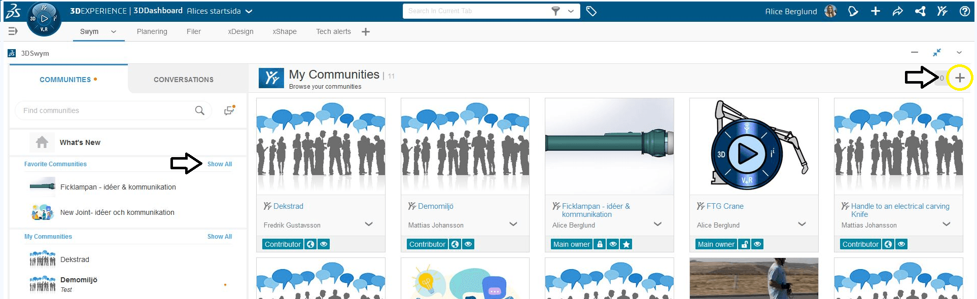 Ifall man har tilldelats rollen som administratör för 3DEXPERIENCE Platform så har man möjlighet att skapa nya Communities. Detta gör man genom applikationen Communities Control Center eller genom att klicka på Show All i 3DSwym’s huvudmeny och sedan på plustecknet i högra hörnet.