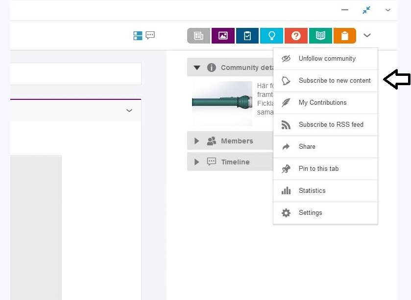 För att lättare hålla sig uppdaterad om vad som händer i ett visst community kan man klicka på Subscribe to new content i nerrullningsmenyn för det valda Communityt. Du kommer då få ett mail, skickat till den mailadress ditt konto är kopplat till, när nya inlägg publiceras. I samma meny kan du även välja att avfölja Communityt eller ändra inställningar.