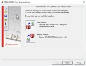 Dina favoritinställningar kan du sedan spara med hjälp av ”Copy Settings Wizard”. Ett tips är att spara dina Settings utan ”System Options” så att du kan använda i alla versioner av SOLIDWORKS.