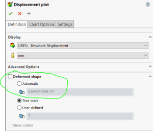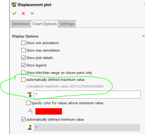 Skulle det fortfarande vara svårt att urskilja de modeller som har flyttat sig kan ni prova med att ändra färgsättningen. Högerklicka om igen på förskjutnings-plotten – välj ”Edit Definition” och den mellersta fliken ”Chart Options”. En bit ner hittar ni möjligheten att välja övre gräns för högsta värdet som presenteras, välj här ett lågt värde, ”1” fungerar oftast bra. Siffran är i den längdenhet ni jobbar i.