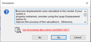 Då och då när vi bygger beräkningsmodeller av sammanställningar, förblir någon komponent helt bortkopplad från resten av delarna som vi vill utvärdera. SOLIDWORKS kommer då att ge oss ett meddelande som säger att ”Excessive displacement….”.