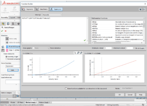 För att koppla storleken på kraften till bollens hastighet valdes Force Function till Expression och ovanstående ekvation matades in. För hastigheten användes motsvarande resultatplot.