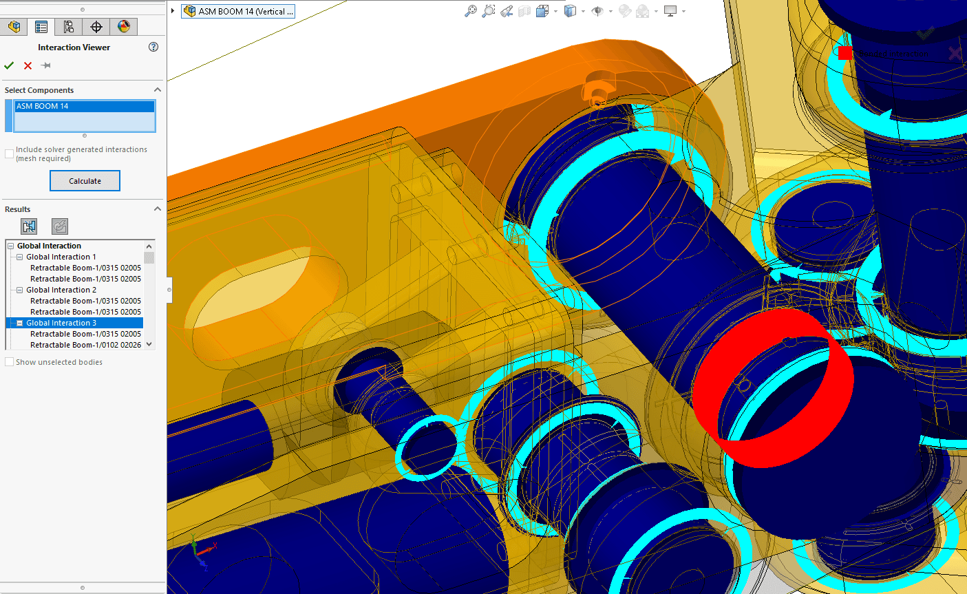 Nedan ser du ett exempel på hur det kan se ut i en större modell med många kontaktytor. Funktionen ger en kraftfull överblick som gör det enklare att säkerställa att alla kopplingar blivit korrekt definierade, redan innan simuleringen körs.
