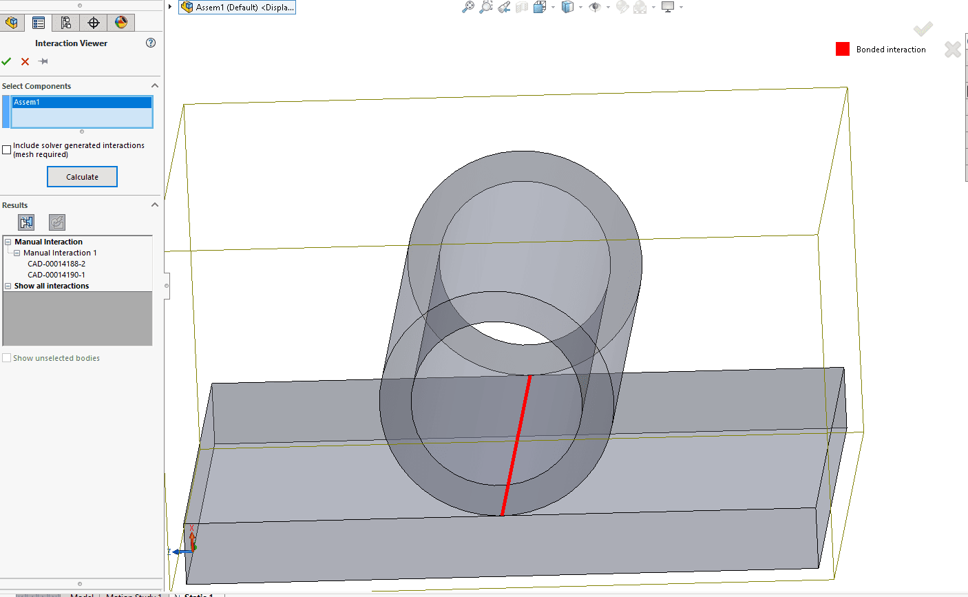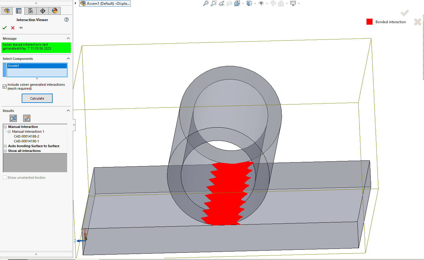 Ett tydligt exempel är scenariot nedan – en linjekontakt mellan två komponenter. Om man endast visar kontakten utan mesh ser man en förenklad linje mellan delarna. Men med mesh aktiverad visualiseras i stället den faktiska kontaktytan, baserat på de påverkade elementens geometri. Det ger en betydligt mer realistisk och detaljerad bild av hur kontakten faktiskt uppstår i modellen.