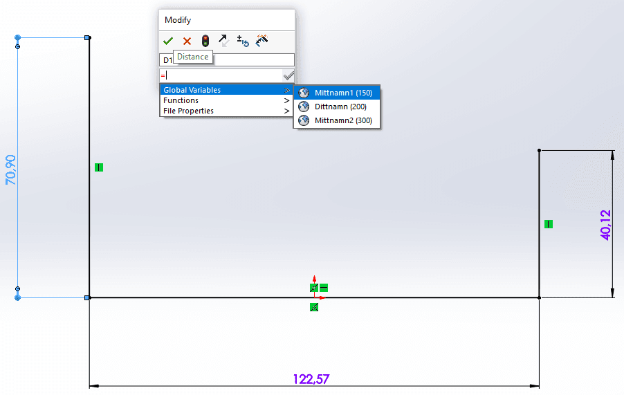 Låt säga att vi nu vill styra våran skiss med hjälp av våra tre variabler. Det vi gör är att vi klickar på ett mått och börjar editeringen med ett likamed-tecken ”=”. Om du ej får upp dialogrutan enligt nedan så kan du dubbelklicka på den lilla bollen som syns i änden på måttsättningslinjen. Under ”Global Variables” välj det värde som du vill att måttet skall kopplas mot.