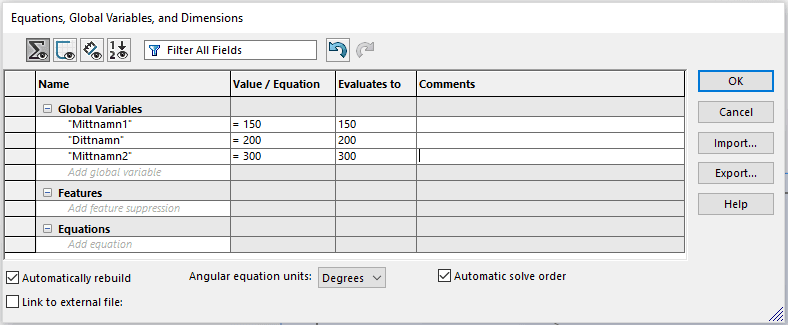 I kolumnen “Name” tillåts användaren att ange ett lämpligt namn för sin globala variabel. I exemplet ovan har tre namn angivits. När ett nytt namn skrivs in ombeds användaren att sätta ett värde på variabeln. I exemplet har tre olika värden angetts. Detta kan till exempel vara längd, bredd och höjd.
