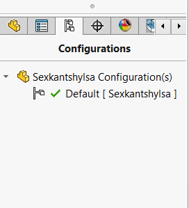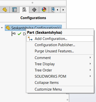 När grundmodellen är klar så kan vi börja lägga till konfigurationer för att skapa olika varianter av modellen. För att skapa en ny konfiguration så klickar du på konfigurationsfliken i FeatureManager Design Tree och sedan högerklicka och välja Add Configuration.