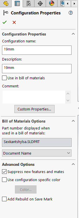 I Propertyfliken som kommer upp för den nya konfigurationen så kan vi namnge den och lägga till beskrivning. Under Advanced Options kan man se till att ha ”Supress new features and mates” ibockat för att de andra konfigurationena automatiskt ska supressa features man lägger till.
