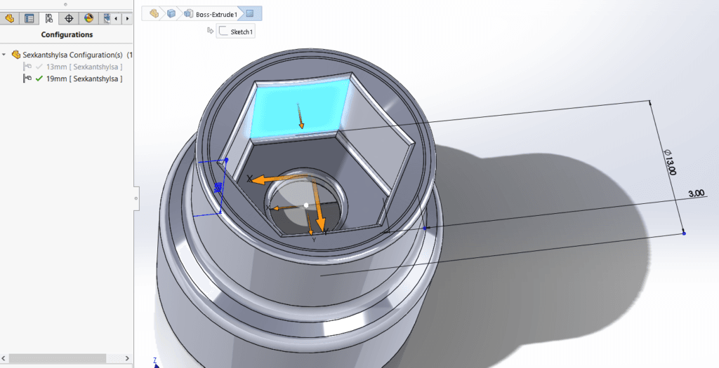 Vi använder oss av en sexkantshylsa i exemplet, en produkt som vanligtvis finns i många olika storlekar på sexkantshålet, medan de flesta andra mått är samma för de olika storlekarna.