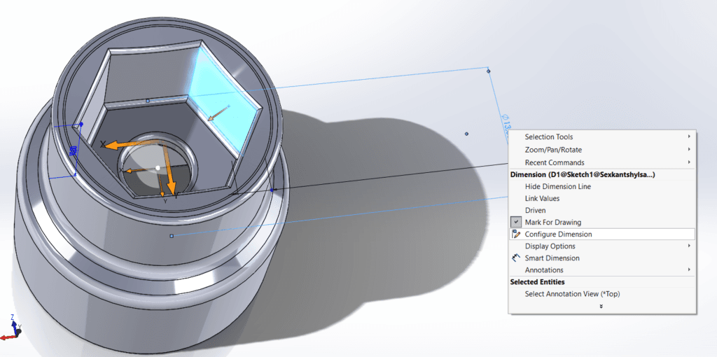 Nu behöver vi göra ändringar i den nya konfigurationen. Det kan vi göra genom att med instant 3d på klicka på en yta som till featuren/skissen vi vill ändra för att synliggöra de tillhörande måtten, och sedan högerklicka på måttet som ska ändras och välja Configure Dimension.