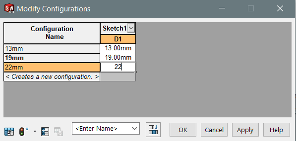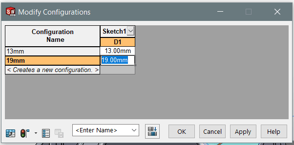Modify Configurations rutan kommer då upp och vi kan ändra måttet. Det går även att därifrån lägga till nya konfigurationer genom att skriva in ett nytt namn längst ner i Configuration Name kolumnen och sedan måttet.