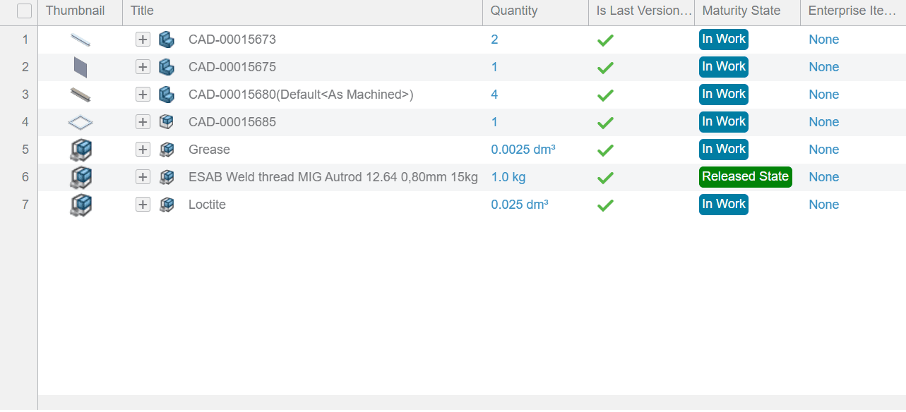 Om vi kollar på EBOM exemplet nedan så kan vi ju ser att den består av några komponenter som är väldigt lätt för mig som inköpare att köpa in som svetstråden, loctite m.m. Det som däremot inte ger mig så mycket som inköpare vid en första anblick är ju 15673 osv. Vad är detta för delar hur behöver dom göras och vilket material behöver vi köpa in?