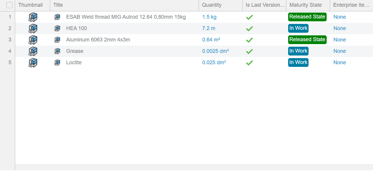 Har man dock i 3DEXPERIENCE använt made from funktionaliteten så är de bara att växla visningsläge till made from så får vi bomen nedan som ger mig en väldigt klar och snabb bild över vad det är som behöver köpas in.
