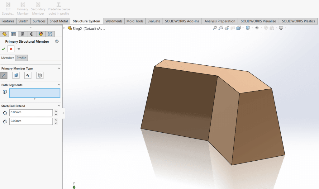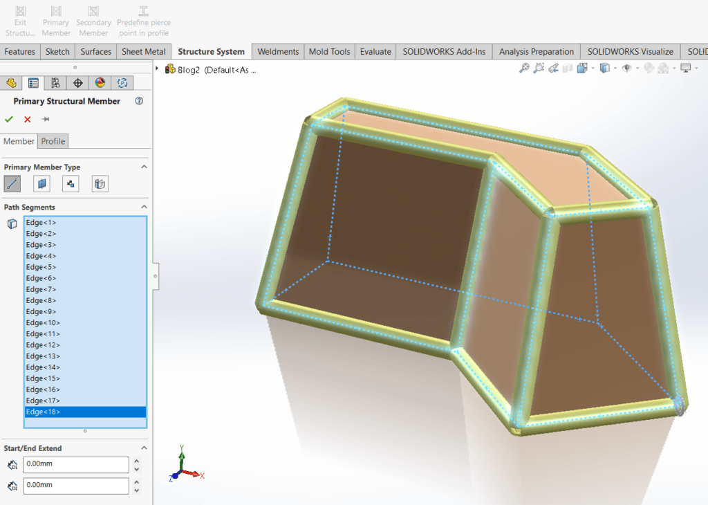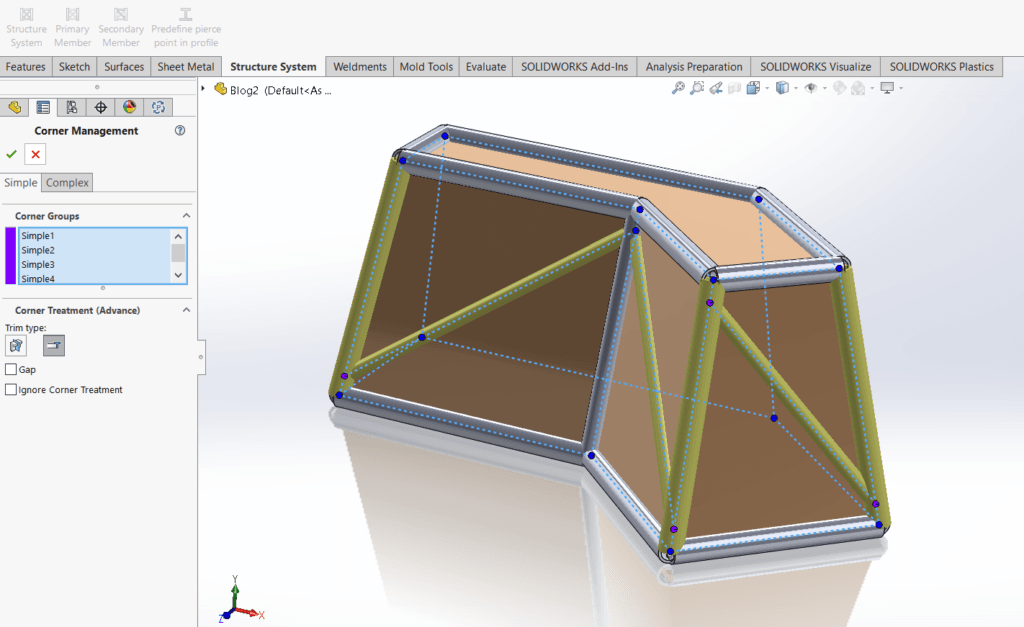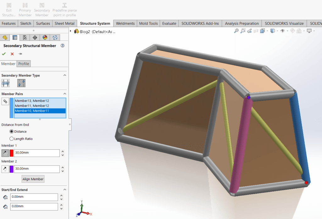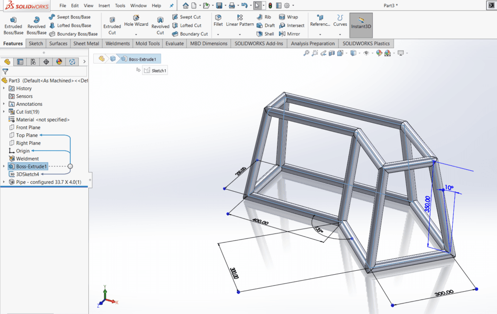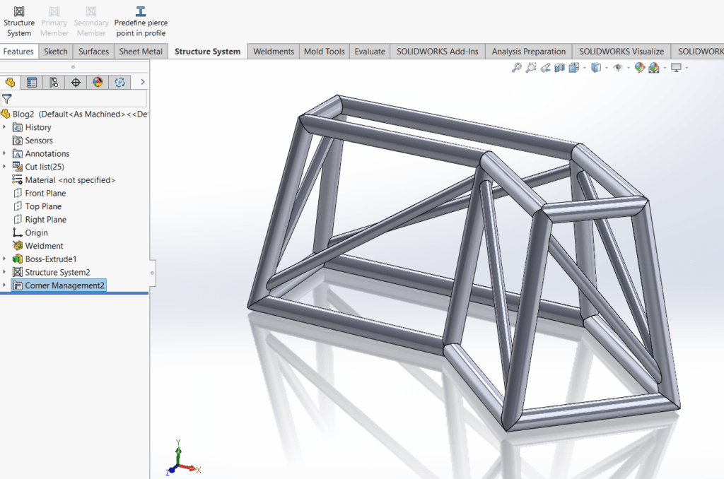Med verktyget Structure System som lanserades i Solidworks 2019 så kan man göra en likadan weldment modell, utan att behöva skapa en 3D skiss och med möjligheten till fler funktioner.