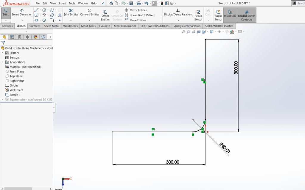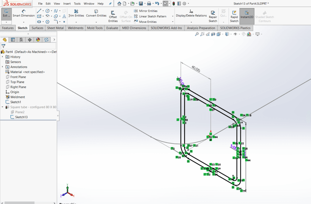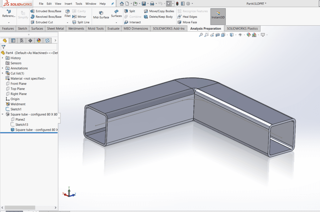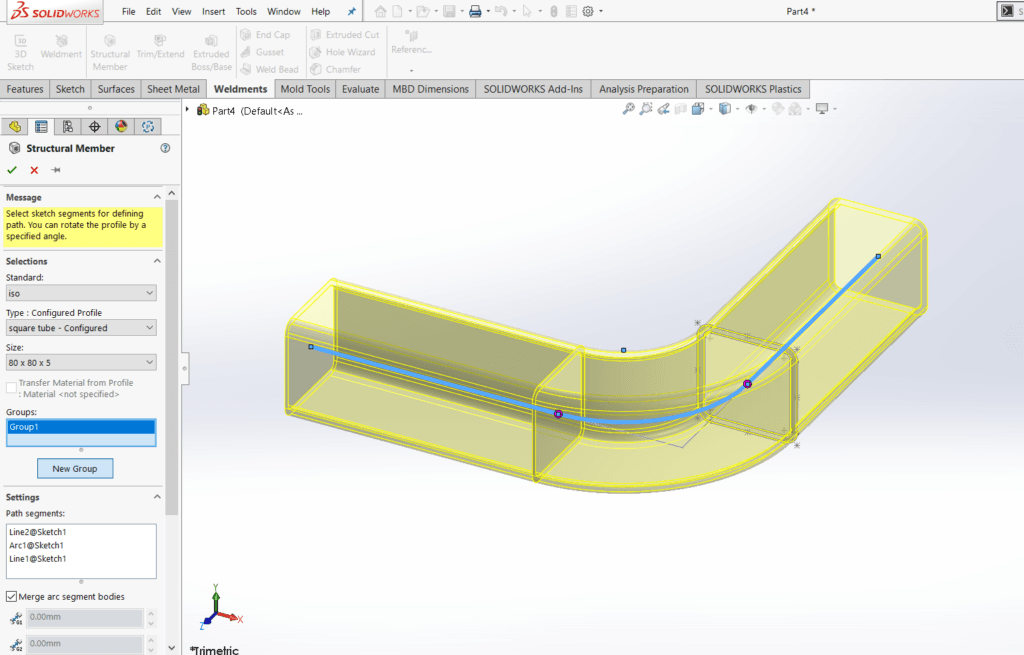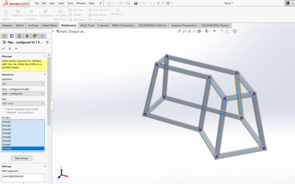Det kan vara svårt att skapa en avancerad 3D sketch och ibland kan det vara enklare att skapa samma geometri med solida kroppar. Därför visar vi nu hur du kan använda solida modeller för att skapa 3D sketcher som kan användas för t.ex. i detta fall weldments.