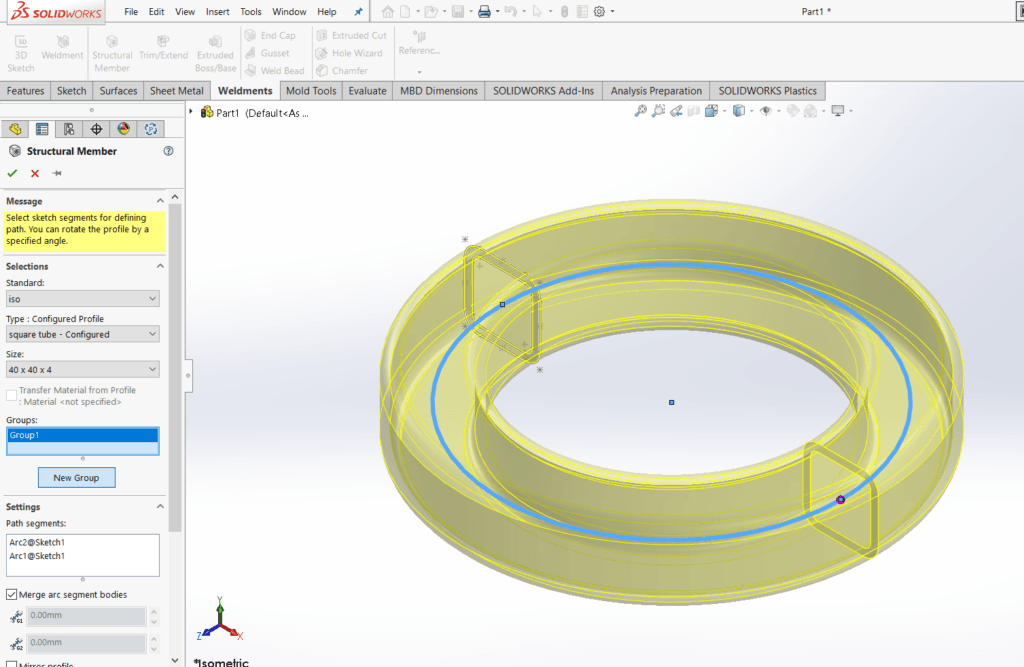 Det går inte att skapa en weldment med en cirkel som path. Istället kan man då skapa en cirkel med två cirkelbågar och använda dem som path. Att det inte går beror på att ett path till en weldment måste innehålla en start och en slutpunkt för varje segment, något som en cirkel saknar.