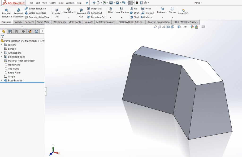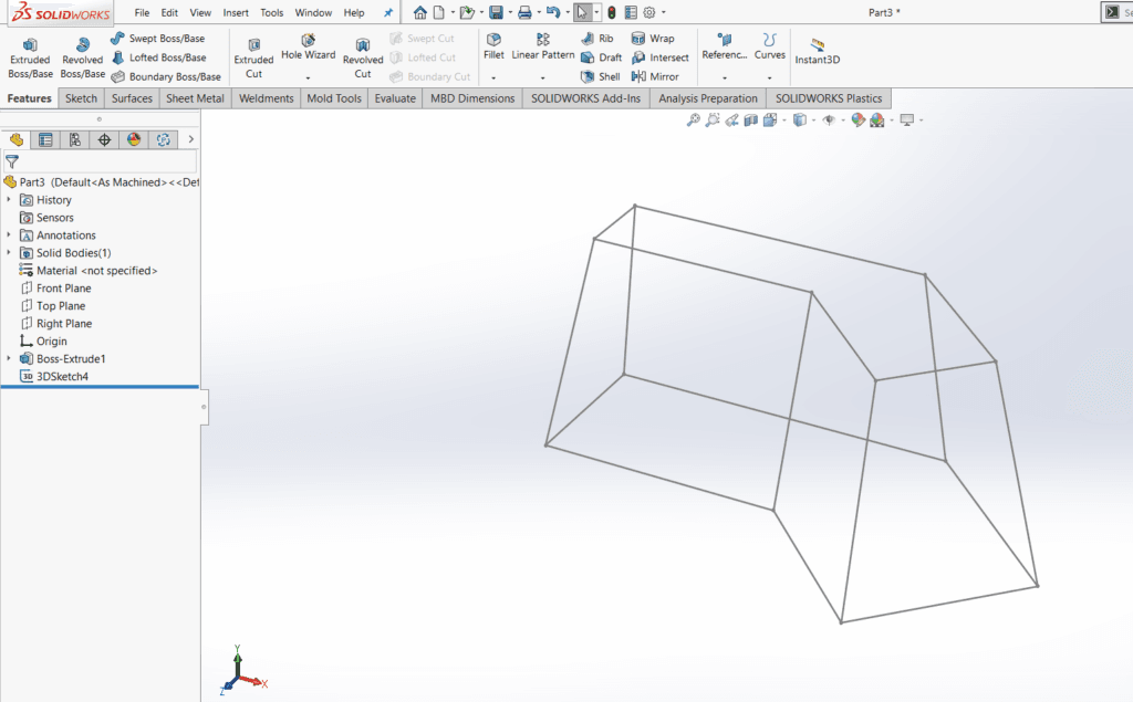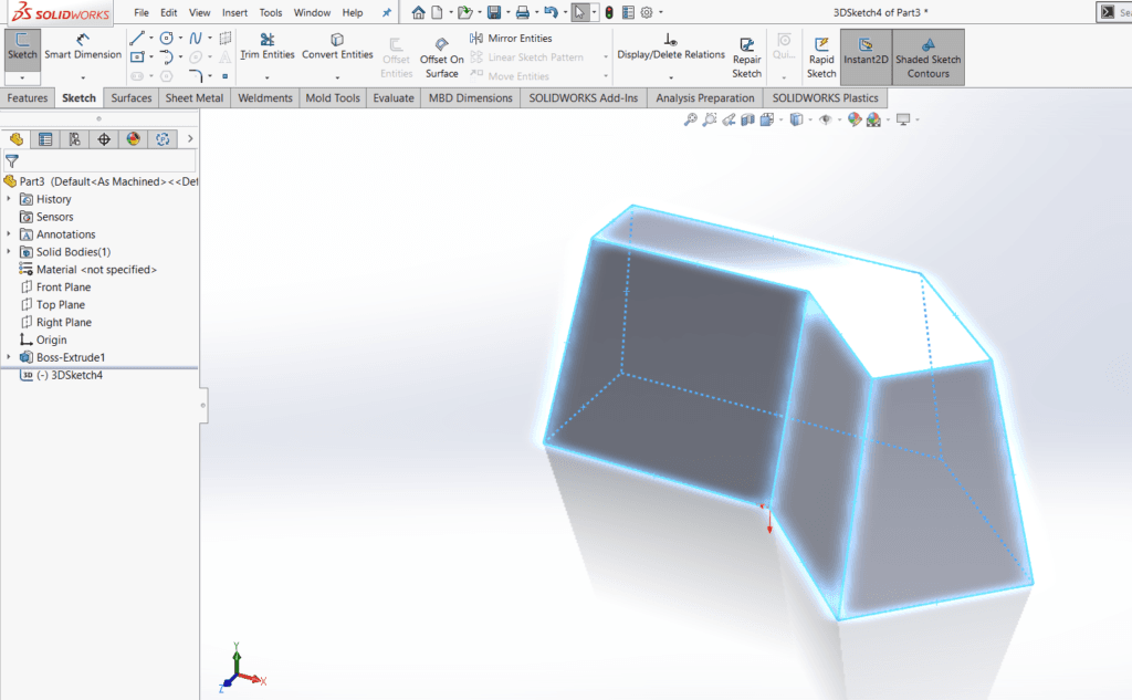 Den här modellen är väldigt simpel att göra med en skiss och en extrudering. Att göra kanterna med en 3D sketch hade krävt referensplan och mer måttsättning.
