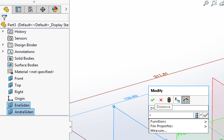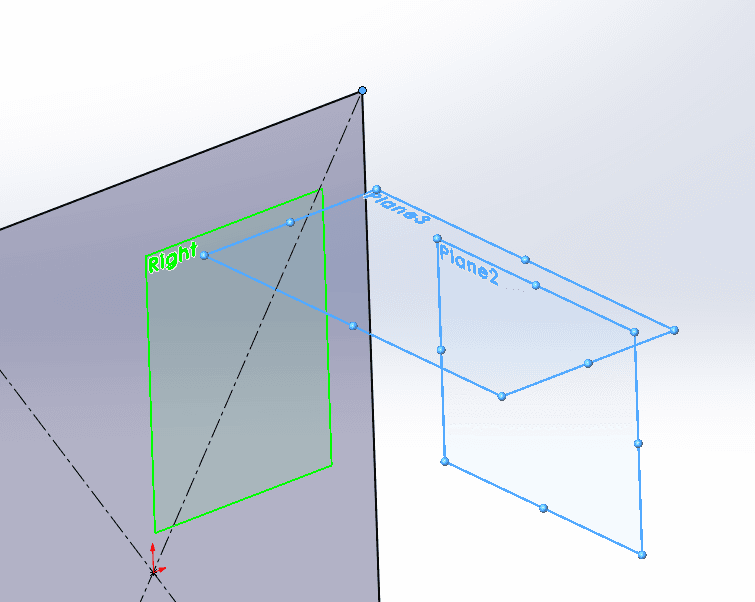 En annan användbar ref.plans variant är att definiera ett plan parallellt med t.ex Right planet, definiera sedan ett nytt plan parallellt med det nyss skapade, så att det sist skapade planet hamnar på andra sidan Rightplanet. Resultatet ska bli ett plan på enasidan om Rightplanet och ett plan till på andrasidan om rightplanet. Planet på andra sidan Rightplanet ska inte refere