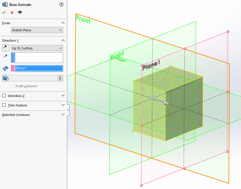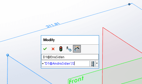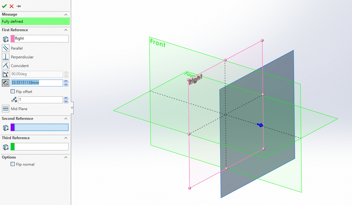 ra till Rightplanet utan till planet som skapades först. Poängen med denna manöver är nu att den dimensionen som beskriver positionen till det första planet ska sättas till att vara lika hälften av dimensionen till det andra planet. På så sätt kommer Rightplanet att definiera ett mittplan med ett referensplan på vardera sidan om sig som flyttar sig symmetrisk när dimensionen som beskriver positionen till det andra planet ändras