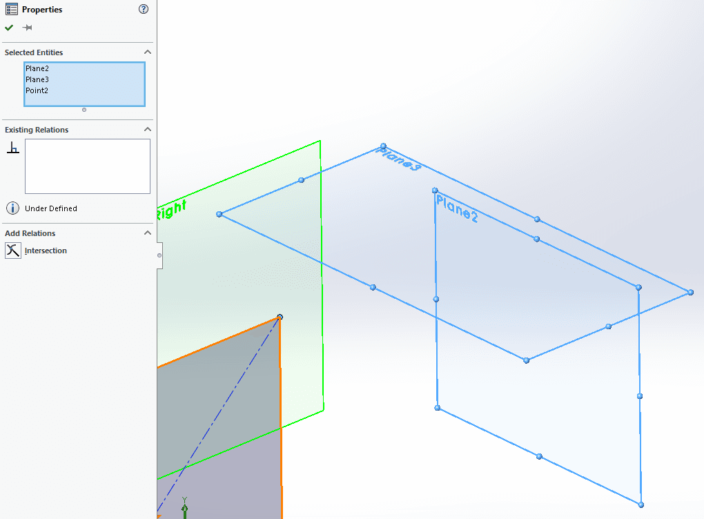 En annan manöver ni kan testa är att skissa på ett plan som har två plan definierade vinkelrät mot skissplanet och vinkelrätt mot varandra. Välj en punkt eller en ände på en linje och sedan med kontrollknappen nedtryckt de två vinkelräta planen. Med dessa tre entiteter valda kommer ni att få möjlighet att välja skissrelationen Intersection. Vald skiss punkt eller linjeände kommer nu att låsas till där dessa två plan möts.