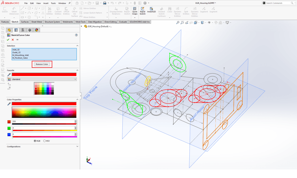 Välj färger som sticker ut. Det kan tex vara bra att undvika blå, svart och grå för att inte blanda ihop skissfärger med SOLIDWORKS standardfärger.