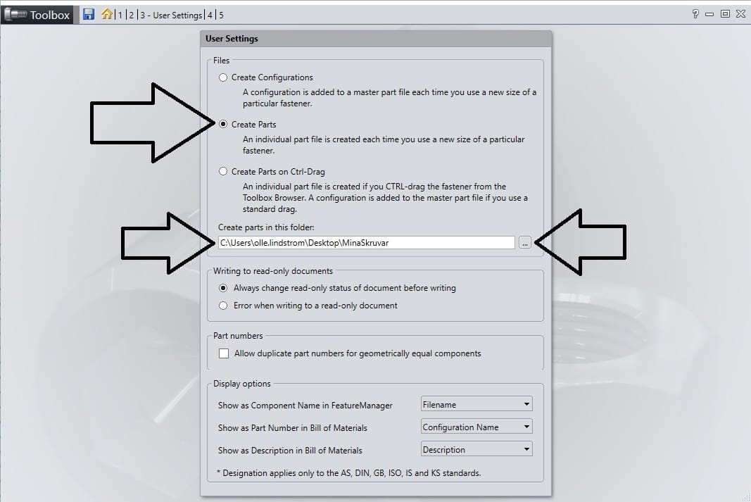 För att ändra att våra valda komponenter ska bli parter med olika storlekar, så går vi under alternativ ”3. Define user settings”. Där i hittar vi alternativet ” create parts” och klickar i. Samt så pekar vi ut en mapp där vi vill att våra delar ska hamna. OBS peka inte ut era befintliga toolbox mapp så ni råka skriva över något utav misstag. Välj en ny lämplig plats. Se bild nedan.