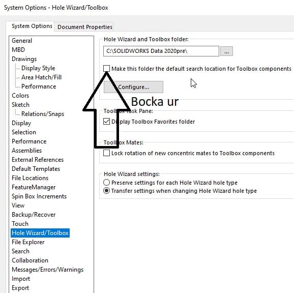 Jag ska nämna en till sak. Dessa toolbox parter är fortfarande massa intelligence i sig att den är en toolbox komponent. Vi har egentligen bara sparat ut kopior som ser ut som parter. Jag skulle också råda att bocka ur denna inställning i solidworks om ni väljer att jobba med toolbox komponenter på detta sätt. Se bild nedan.