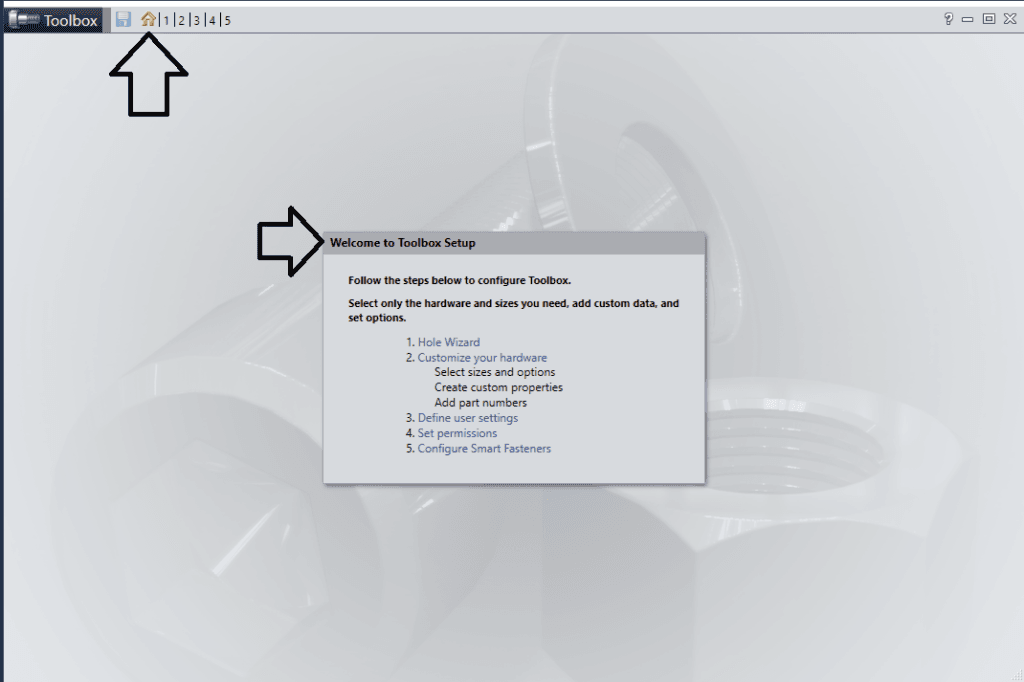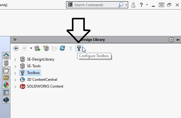 Vi kommer göra detta ifrån Toolboxen konfigurator som vi kan starta ifrån solidworks. Där ifrån kan vi ändra vad som ska vara tillgängligt i toolboxen och lite andra grejer. Se bilden nedan.