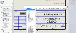 Titelblockets teckensnitt i underlagsformatet (Sheet format) ställs in manuellt och kan sparas som en Sheet Format-mall.