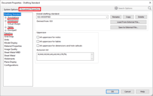 Inställningarna kan sparas i en Drafting Standard-fil (*.slddft). Valet av -Drafting Standard förutsätter att valda teckensnitt finns på datorn där filen öppnas.