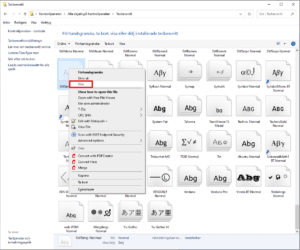 - Teckensnittet kan vara dolt i Windows kontrollpanel – Teckensnitt, det går att visa igen genom att högerklicka och välja ”Visa”.