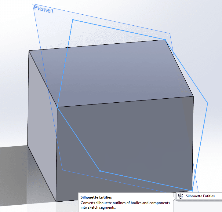Den andra nya finessen som jag vill upplysa i denna blogg är ”Silhouette Entities” som påminner väldigt mycket om ”Convert entites” och det funkar nästan likadant. Med lilla ändringen och fördelen att vi väljer en kropp istället. Och där med kan få hela ytterkonturen utav den kroppen projicerat till en linje i sketch. Verktyget startar du när du är i en sketch. I bilden nedan ser du ett enkelt exempel gjort med kub.