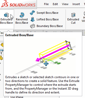 Den sista funktionen för 2020 som jag vill upplysa är en enkel påbörjad förbättring. Om man håller till exempel musen på boss-extrude kommandot i solidworks så får man se en liten kort bildspelning vad kommandot gör.