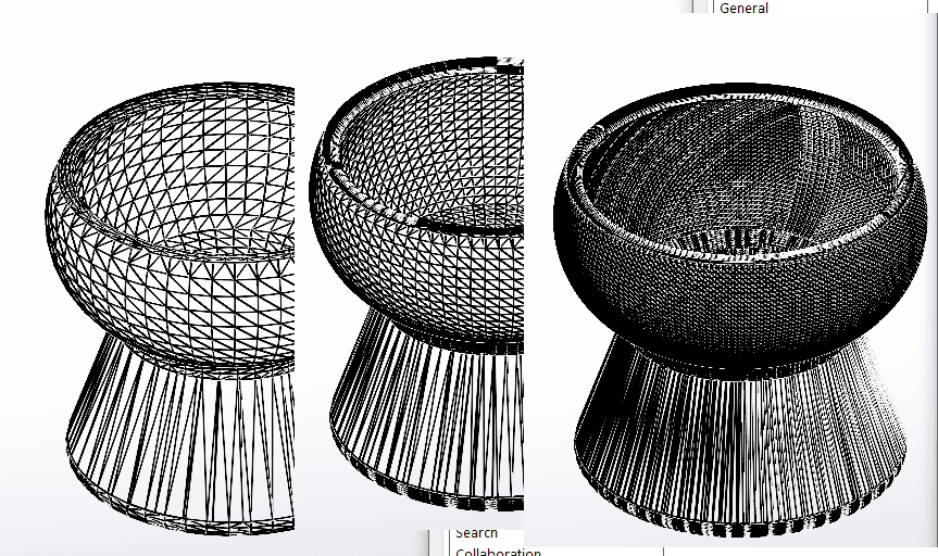 STL-filer är uppbyggda av trianglar. Beroende på vilket av Resolution valen vi gör så får vi tre olika resultat. Dessa påminner lite om dokumentinställningen Image Quality, men har inte med varandra att göra. Det som påverkas med de olika inställningarna är antalet polygoner som parten delas upp i.