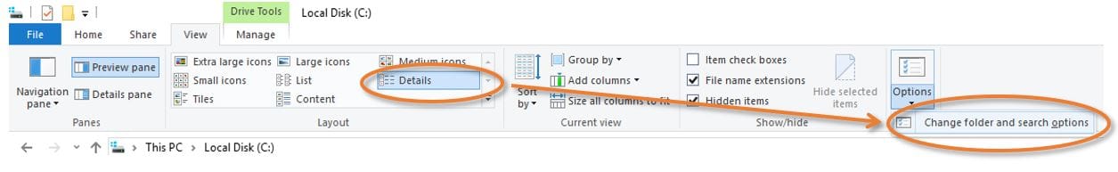På View-fliken, ställ in vyn till Details och gå till Options > Change folder and search options Vi rekommenderar att man använder visningstyp Details för att kunna se alla kolumner och informationen i dem!