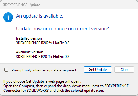 När en ny uppdateringen kommit brukar man även få en notis kring detta när man öppnar SOLIDWORKS. Det går även att starta uppdateringen via detta fönster, genom att klicka på Get Update.