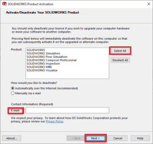 Välj Select All för att markera alla produkter. Välj metod för att avaktivera licenserna (automatisk över internet rekommenderas), ange din e-postadress och klicka sedan på Next. Tyck slutligen på Finish.