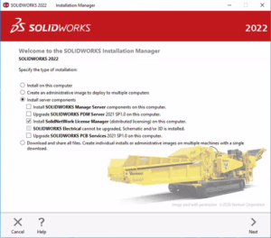 Dubbelklicka på den nedladdade installationsfilen SolidWorksSetup.exe för att extrahera filerna och starta SOLIDWORKS Installation Manager. Om du redan har extraherat de nedladdade filerna, klicka på filen sldIM.exe eller setup.exe för att starta Installation Manager. På välkomstsidan, välj Install server components och alternativet Install SolidNetWork License Manager och klicka sedan på Next. Är det bara en uppgradering av Service Pack med samma årgång så kommer det istället att stå Upgrade SolidNetWork License Manager.