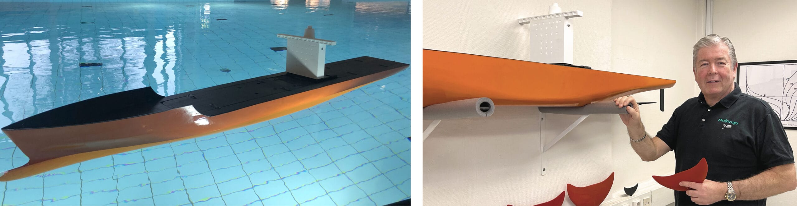 Dolprop Industries har fler aktuella projekt, bla the Ship version och Jemt Converter. The Ship version är arbetsnamnet på den stora fenan för containerfartyg, men modellen heter SH1 Ship på riktigt. På bilden ser vi Thomas bredvid en skalenlig modell,1:100, av ett containerfartyg Moeri (KCS) och baktill ser vi prototypen av delfinfenan. Detta är en modell som används för forskning världen över och denna modell byggdes på verkstaden under pandemin. Modellen används för att testköra fentekniken och modellen kommer upp i skalenlig hastighet för ett containerfartyg. I verkligheten är fenan ca 14 meter bred och fenan är byggd i ett utprovat flexibelt material.